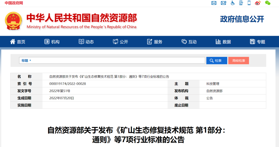 《礦山生態(tài)修復(fù)技術(shù)規(guī)范 第1部分:通則》等7項(xiàng)行業(yè)標(biāo)準(zhǔn)已通過全國自然資源與國土空間規(guī)劃標(biāo)準(zhǔn)化技術(shù)委員會(huì)審查,現(xiàn)予批準(zhǔn)、發(fā)布,自2022年11月1日起實(shí)施。標(biāo)準(zhǔn)編號(hào)及名稱如下: