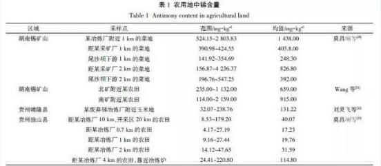 我國豐富的銻資源在促進了工業以及醫療等領域發展的同時,也帶來了一定的環境隱患。根據近年來對銻礦山周圍農用地土壤的調查研究發現,土壤中的平均銻含量多集中于17.23~1 438.00 mg˙kg-1,遠高于湖南省(2.98 mg˙kg-1)和貴州省(2.24 mg˙kg-1)背景值,且在不同的地方其污染程度表現出較大的區別。主要是由于廢礦、爐渣堆放的緣故以及受到銻塵、煙氣沉降、雨水淋溶等因素的影響,造成銻等重金屬遷移至土壤之中,使得附近的河流、土壤以及植物中經常能檢測到較高的銻含量。此外銻可以隨大氣、河流等遷移至遠離污染源的地區,形成跨區域遠程污染。項萌等研究發現,廣西河池南丹縣銻礦冶煉區土壤銻的濃度為195~2 034 mg˙kg-1,且其含量與距離冶煉廠的距離密切相關,其中在0~400 m 內急劇衰減,衰減幅度達90%,在400~2 400 m 范圍緩慢衰減,影響范圍可以達到很遠,而在3 種不同土壤環境中(水稻田、菜地、荒地),銻含量表現為水稻田>菜地>荒地。也有研究表明,過去的30 年內,北極圈大氣中的銻含量增加了50%,證實了跨區域銻污染的可能性。但調查研究發現,由于對銻污染及健康風險認識的不足以及環保治理意識較弱,礦區80%的農民只有在確實種不出農作物的時候才意識到土壤被污染了,且農用地的利用多樣性較低,結構表現單一。