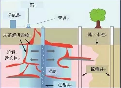 化學氧化一還原技術是通過向土壤中投加化學氧化劑(Fenton試劑、過硫酸鈉、過氧化氫、高錳酸鉀等)或還原劑對土壤進行修復,常用的還原劑為含鐵類還原劑(零價鐵、納米零價鐵和亞鐵類還原劑)、還原性硫化物(H2S、FeSx、硫代硫酸鹽等)及一些具有還原活性的有機物。通常,化學氧化技術是向污染場地中加入化學氧化劑,依靠化學氧化劑的氧化能力。分解破壞污染環境中污染物的結構,使污染物降解或轉化為低毒、低移動性物質的一種