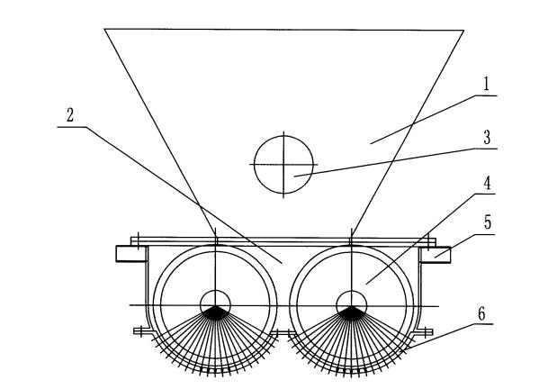 所述破碎刀具及其刀尖的排布方式可以有以下兩種:第一種方式,所有破碎刀具的刀尖分為縱向的若干列,而每一列中的所有刀尖呈“人字”形排列;第二種方式,所有破碎刀具的刀尖在破碎轉(zhuǎn)子外圍的圓柱面上沿一條螺旋線排列。此外,為進(jìn)一步保證破碎質(zhì)量,在破碎倉(cāng)內(nèi)的側(cè)上部安裝有梳狀泥石分離器,以將較硬的石塊分離出來(lái)。不僅提高了土壤的破碎效率,并且破碎質(zhì)量得到了保證,能夠滿足高等級(jí)公路的施工要求。