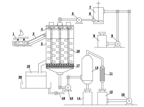圖中:1振動篩、2投料傳送帶、3淋洗罐、4淋洗劑噴頭、5引流泵、6攪拌漿、7中間罐、8淋洗劑存儲罐、9提取泵/10循環(huán)泵Ⅱ、11冷凝器、12循環(huán)液收集罐、13沉降過濾倉、14沉渣罐、15循環(huán)泵Ⅰ、16連通管路、17過濾層、18攪拌器、19二次沉降池、20環(huán)形沉降液收集池。