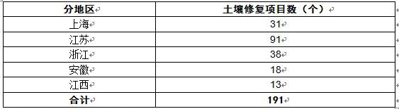 一、華東區域(上海、江蘇、浙江、安徽、江西)土壤修復市場 圖表1:華東區域2019年土壤修復項目數據