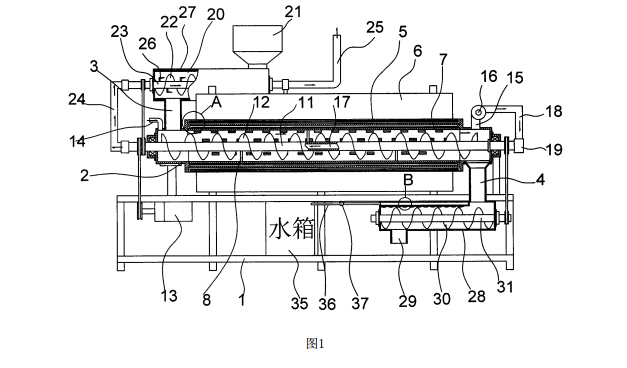 土壤從進(jìn)料斗處進(jìn)入預(yù)加熱筒內(nèi),進(jìn)料絞龍軸內(nèi)的高溫氣體對土壤進(jìn)行預(yù)加熱,提高土壤溫度,同時進(jìn)料絞龍軸上的刀片把塊狀土壤切碎,預(yù)加熱并切碎后的土壤進(jìn)入加熱筒內(nèi)被二次加熱,加熱過程中,螺旋帶、轉(zhuǎn)筒對土壤進(jìn)行翻轉(zhuǎn)、分散,提高土壤加熱效率,溫度加熱到150℃以上時,土壤中的中苯、甲苯、二甲苯、乙苯等有害物質(zhì)從土壤中揮發(fā)出來形成氣態(tài),氣態(tài)的毒害物質(zhì)被排風(fēng)機(jī)吸走,最后從尾氣管中排入尾氣處理塔內(nèi),土壤經(jīng)過熱脫附后,土壤中的蟲卵、雜草種子被高溫殺死,土壤中的毒害有機(jī)物被脫附、分解、排放、處理掉,最后干燥的土壤進(jìn)入后處理筒內(nèi),水箱中的肥料溶液噴灑到土壤中,對土壤進(jìn)行增濕、降溫、增肥,最后從排料通道處排出的土壤就能直接用于園林、農(nóng)田、菜園使用。