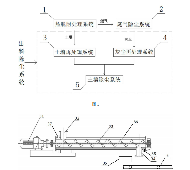 具有出料除塵功能的土壤熱脫附設(shè)備處理系統(tǒng),涉及有機(jī)污染物污染土壤處理除塵技術(shù),包括采用加熱方式處理土壤去除其污染物的土壤熱脫附設(shè)備處理系統(tǒng)和對(duì)熱脫附處理過(guò)程中產(chǎn)生的煙塵進(jìn)行處理的尾氣除塵系統(tǒng),其還包括對(duì)熱脫附處理后的土壤進(jìn)行后續(xù)處理的土壤再處理系統(tǒng)和土壤除塵系統(tǒng),所述土壤再處理系統(tǒng)的輸入與所述熱脫附處理系統(tǒng)的輸出相連,所述土壤除塵系統(tǒng)的輸入與所述土壤再處理系統(tǒng)的輸出相連。本發(fā)明通過(guò)土壤再處理系統(tǒng)和土壤除塵系統(tǒng)對(duì)出料土壤揚(yáng)塵進(jìn)行有效控制,現(xiàn)場(chǎng)操作時(shí),熱脫附設(shè)備的出料口基本沒(méi)有揚(yáng)塵產(chǎn)生,極大地改善了現(xiàn)場(chǎng)的生產(chǎn)環(huán)境,還可以達(dá)到資源的循環(huán)利用。