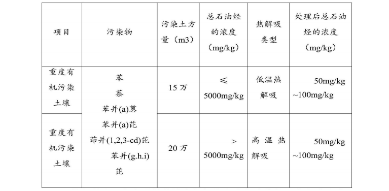 某污染場地為石油化工生產企業,搬遷改造后的遺留場地土壤受到苯、萘和多環芳烴的污染,污染物濃度、土方量及處理信息,參見下圖所示。在只采用高溫熱解吸的技術時,工藝參數 : 高溫熱解吸窯的處理量為 20m3/h,高溫熱解吸窯的出土溫度為 400℃,窯內土壤的停留時間為 15min,每立方污染土的修復能耗為 60m3天然氣 ;采用本發明后,工藝參數 :高溫熱解吸窯的處理量為 20m3/h,低溫熱解吸器的處理量為 14m3/h,高溫熱解吸窯的出土溫度為 400℃,低溫熱解吸器的出土溫度為 150℃,窯內土壤的停留時間均為 15min,立方污染土的修復能耗為 45m3天然氣,可實現節能 25%。