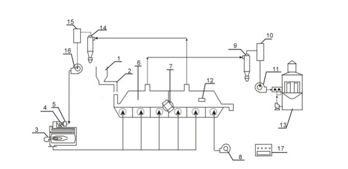 4、污染土壤到達振動床后部時,溫度較高,污染土壤中剩余的水分和大量揮發性 / 半揮發性有機污染物揮發出來,從振動床后部的第二出風口排出,排出的混合氣體經第二旋風分離器旋風除塵和第二布袋布袋除塵后,由第二引風機通入燃燒器,混合氣體中的有機污染物在燃燒器內高溫分解。