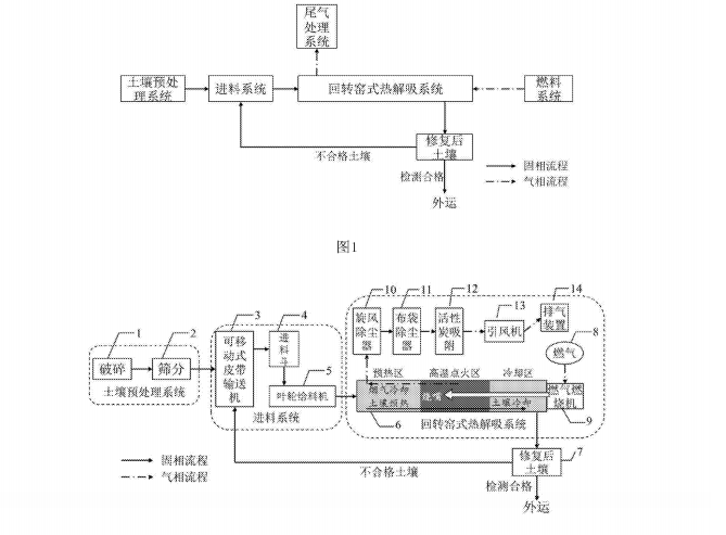 特征在于:所述的污染土壤預(yù)處理系統(tǒng)包括破碎裝置和篩分裝置,所述的進(jìn)料系統(tǒng)包括可移動(dòng)式皮帶輸送機(jī)、進(jìn)料斗和葉輪給料機(jī),可移動(dòng)式皮帶輸送機(jī)的兩端分別污染土壤預(yù)處理系統(tǒng)的出料口、進(jìn)料斗的進(jìn)口相連,并經(jīng)進(jìn)料斗的出口與葉輪給料機(jī)相連;所述葉輪給料機(jī)與回轉(zhuǎn)窯式熱解吸系統(tǒng)的固體進(jìn)料口相連;被污染土壤在配置燃?xì)馊紵龣C(jī)的回轉(zhuǎn)窯內(nèi)實(shí)現(xiàn)熱解吸,氣化物經(jīng)吸附處理后導(dǎo)引至排風(fēng)裝置;經(jīng)冷卻后的已處理修復(fù)土壤顆粒在檢測(cè)合格后自回轉(zhuǎn)窯排出。