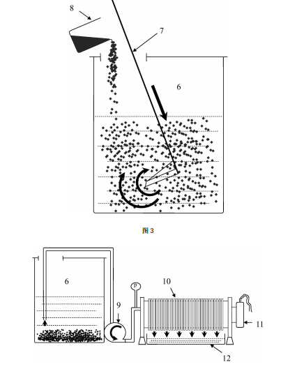 罐中通過加藥器加入藥劑,第二攪拌器攪拌塑料儲罐內的溶液 ;沉淀去除所使用的設備包括塑料儲罐、第三螺桿泵、壓濾機、第二電動機和蓄水池,第二電動機設于壓濾機的一端,蓄水池設