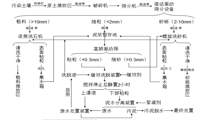 (3)分級后的細(xì)粒直接進(jìn)入或進(jìn)行增效洗脫后進(jìn)入污泥脫水系統(tǒng),泥餅根據(jù)污染性質(zhì)選擇最終處理處置技術(shù);
