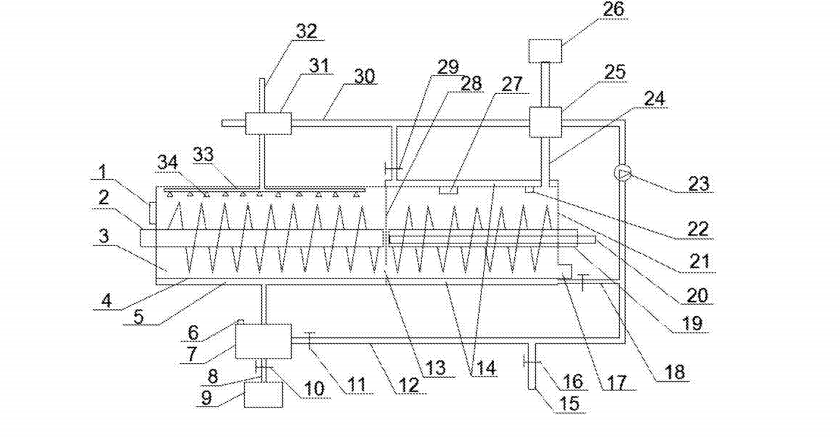 工作原理是:污染土壤從修復(fù)箱的進料口進入噴淋修復(fù)室后,同時啟動第一螺旋輸送機和噴淋設(shè)備,外部的淋洗劑經(jīng)淋洗劑進入噴淋裝置并對污染土壤進行淋洗,淋洗過程中,第一螺旋輸送機的旋轉(zhuǎn)軸轉(zhuǎn)動帶動螺旋葉轉(zhuǎn)動,對污染土壤進行攪拌,使淋洗劑與污染土壤混合均勻,修復(fù)徹底,同時,修復(fù)后的土壤在第一螺旋輸送機的作用下經(jīng)隔板下端的通孔進入土壤熱解吸修復(fù)室,而與污染土壤接觸并修復(fù)后的淋洗劑經(jīng)噴淋修復(fù)室底部的濾網(wǎng)進入集液腔,然后經(jīng)淋洗劑冷管進入第一換熱器。土壤進入熱解吸修復(fù)室后,啟動土壤加熱裝置對土壤進行加熱,第二螺旋輸送機的螺旋葉片轉(zhuǎn)動有利于使土壤均勻受熱,受熱的土壤中的有機物則從固相轉(zhuǎn)變?yōu)闅庀啵⒔?jīng)廢氣管道排出,通過廢氣官道上的第一換熱器,將廢氣中的熱量傳遞給流經(jīng)第一換熱器的淋洗劑,通過第二換熱器的溫度控制系統(tǒng)調(diào)節(jié)淋洗劑進管中的淋洗劑溫度至所需溫度,確保修復(fù)效果。完成熱解吸修復(fù)后的土壤則通過第二螺旋輸送機從修復(fù)箱的出料口排出。