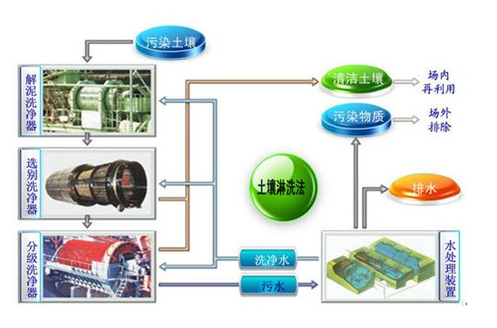 異位土壤淋洗是指把污染土壤挖掘出來,通過篩分去除超大的組分并把土壤分為粗料和細料,然后用淋洗劑來清洗、去除污染物,再處理含有污染物的淋出液,并將潔凈的土壤回填或運到其他地點。該技術操作的核心是通過水力學方式機械地懸浮或攪動土壤顆粒,土壤顆粒尺寸的最低下限是9.5mm,大于這個尺寸的石礫和粒子才會較易由該方式將污染物從土壤中洗去。通常將異位土壤淋洗技術用于降低受污染土壤量的預處理,主要與其他修復技術聯合使用,當污染土壤中砂粒與礫石含量超過50%時,異位土壤淋洗技術就會十分有效,而對于粘粒、粉粒含量超過30%~50%或者腐殖質含量較高的污染土壤,異位土壤淋洗技術分離去除效果較差。如何從淋出液中回收利用化學助劑,成為制約土壤淋洗技術廣泛用于工程實踐的一個主要問題,這中間主要涉及化學助劑的成本、如何實現土壤淋洗技術與其他修復技術的有效組合。在未來的土壤修復中,異位土壤淋洗技術具有較為廣闊的應用前景。
